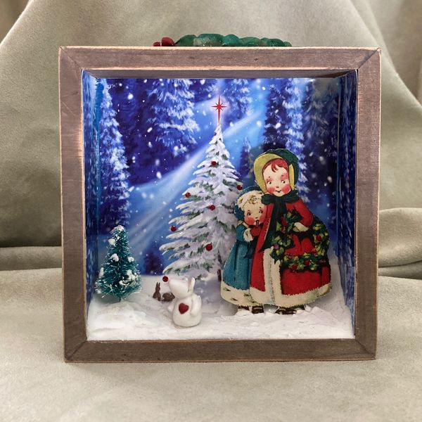 Vintage card and porcelain mouse in 4" sq wooden box.
